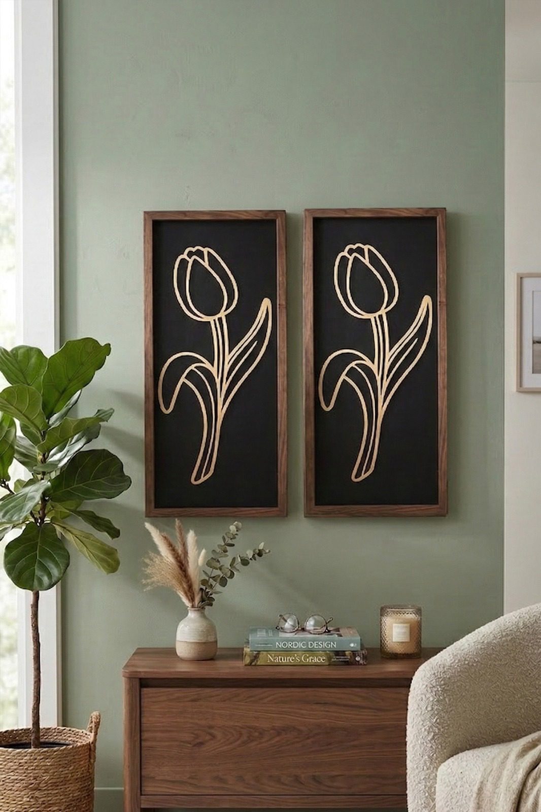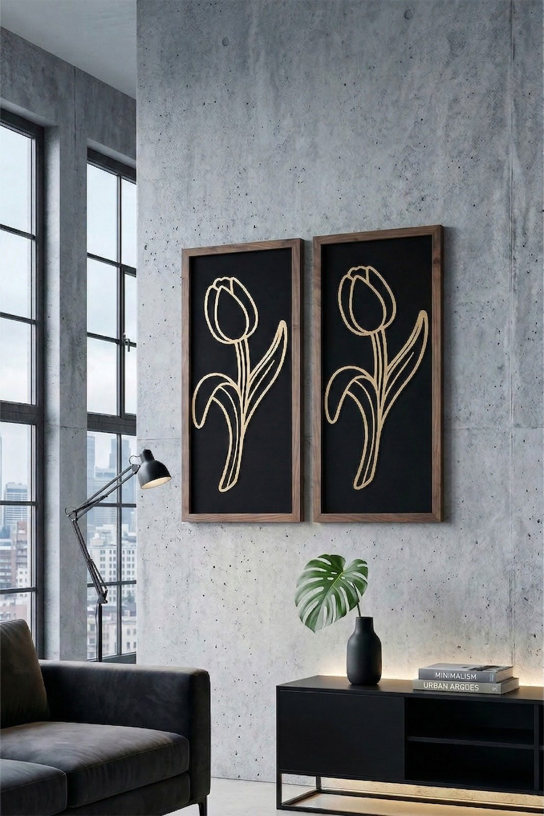 Bu özel sette yer alan birbiriyle eş iki adet lale figürü, evinde simetriyi, sadeliği ve düzeni sevenler için tasarlandı. Doğal ahşap çerçevelerin mekana kattığı sıcaklık ve siyah zemin üzerindeki 3 boyutlu gold çizgiler, duvarınızda modern bir sanat galerisi atmosferi yaratacak.