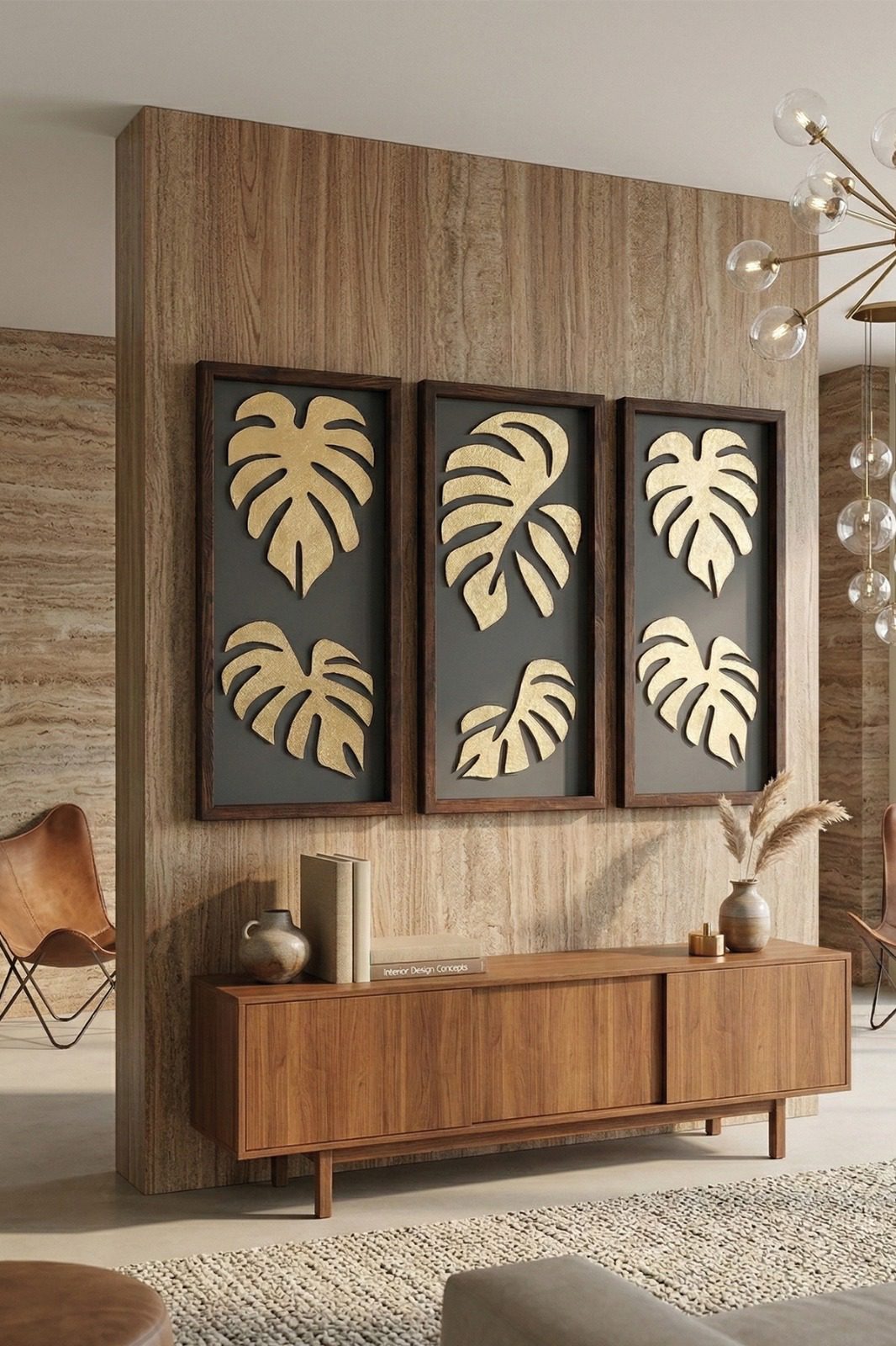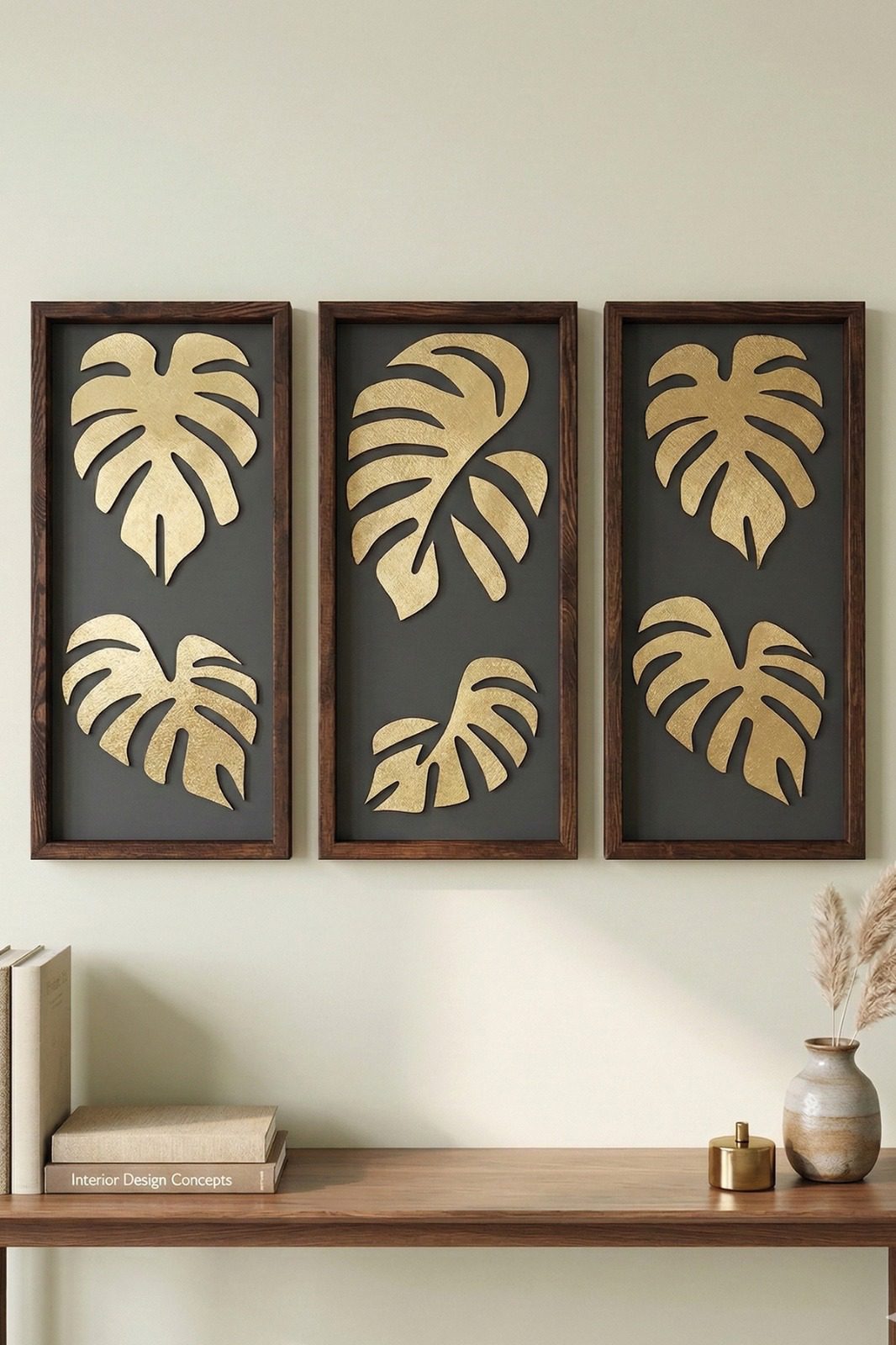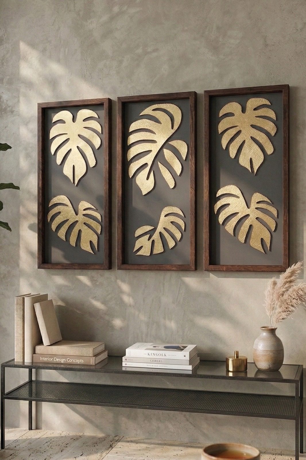 Duvarlarınızda Tropikal Lüks Rüzgarı: 3’lü Gold Yaprak Ahşap Tablo Seti