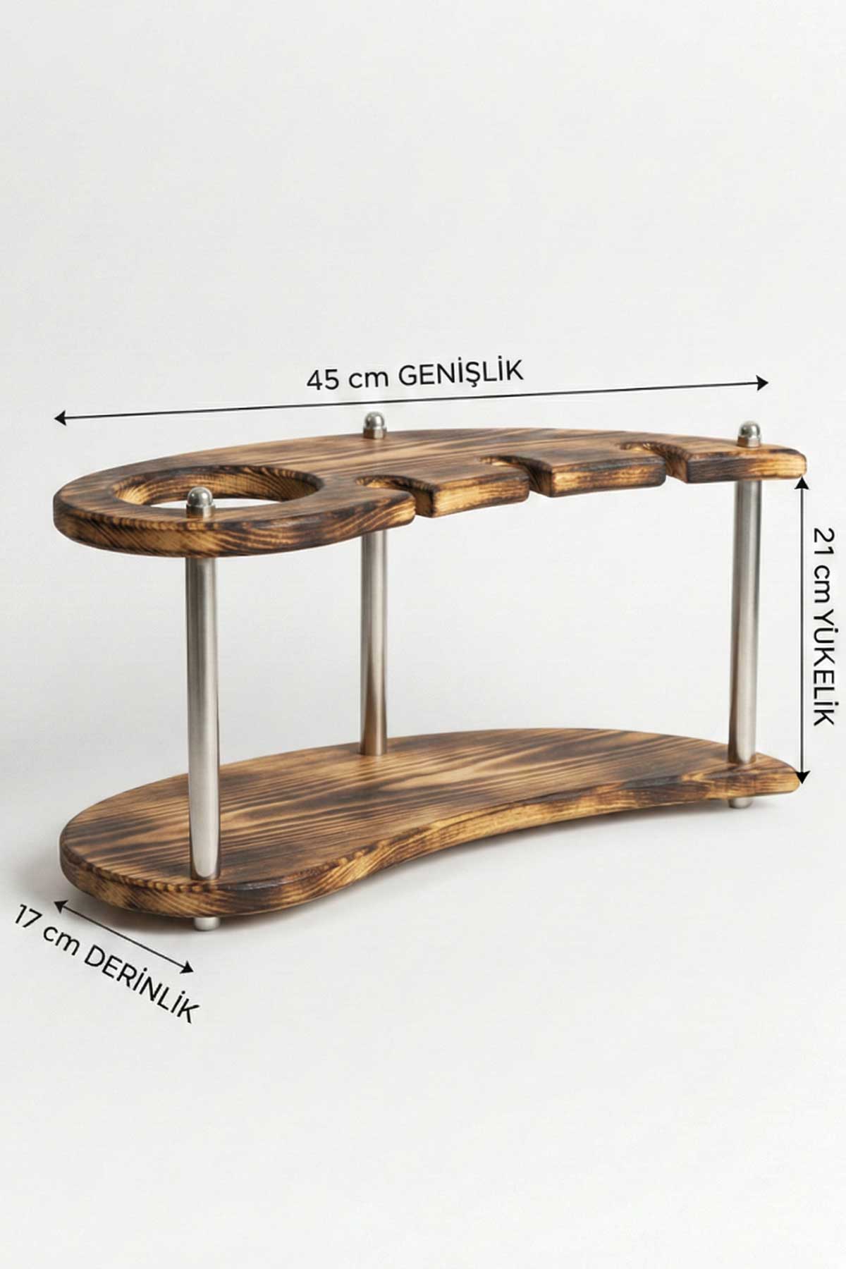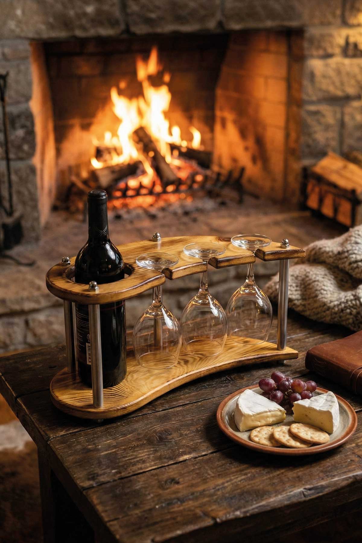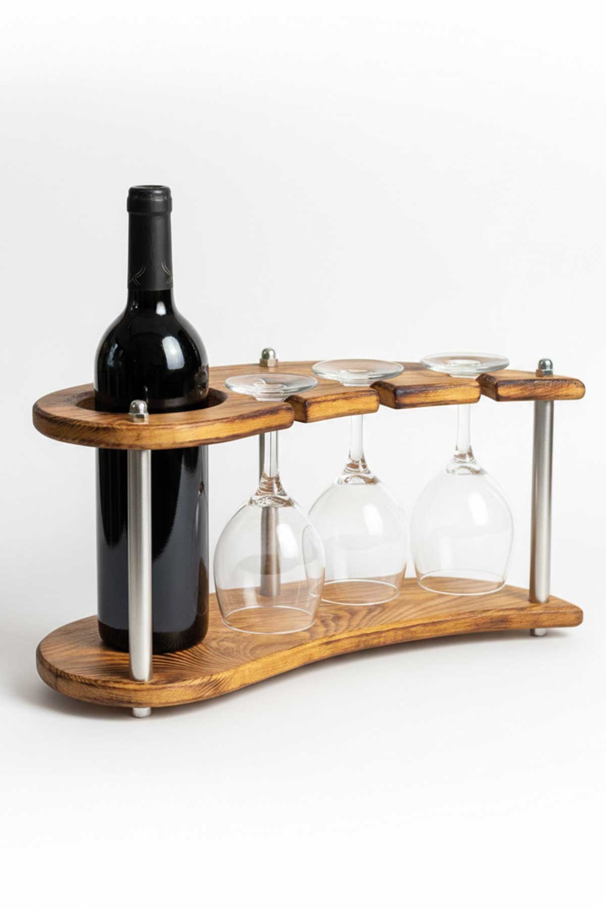 Doğal Ahşap Şişe ve Kadeh Standı – 3’lü Dekoratif Şaraplık ve Sunum Ünitesi