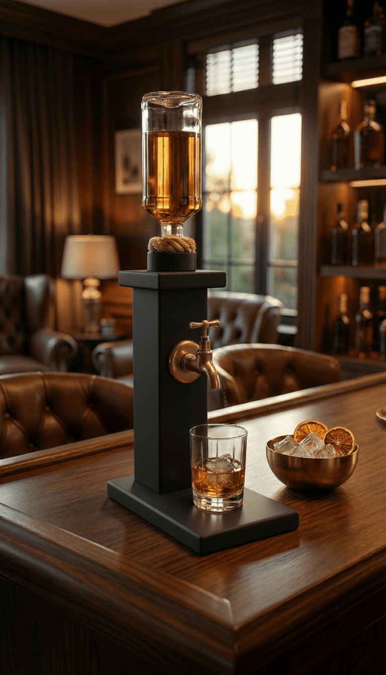 Zarafet detaylarda gizlidir. Masanızda yer kaplamadan büyük bir prestij yaratan bu minimalist viski çeşmesi, tamamen doğal çam ağacından el işçiliği ile üretilmiştir. İnce ve dikey sütun tasarımı, dar alanlarda (ofis masası, kitaplık rafı vb.) bile şık bir içki sunum alanı oluşturmanızı sağlar.